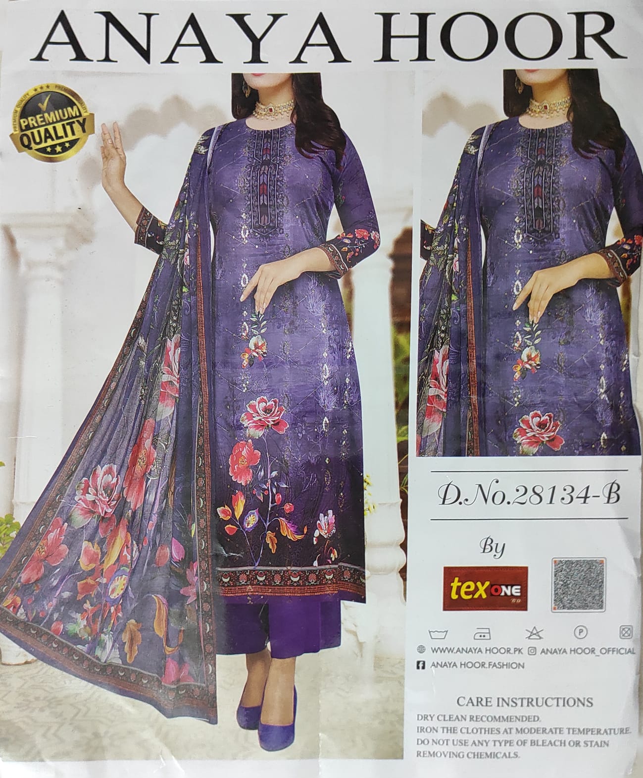Unstitched Digital printed cotton 3 PieceBrand: Anaya hoor Digital Printed with CarchupiColor: same as picture Dry cleaning recommend